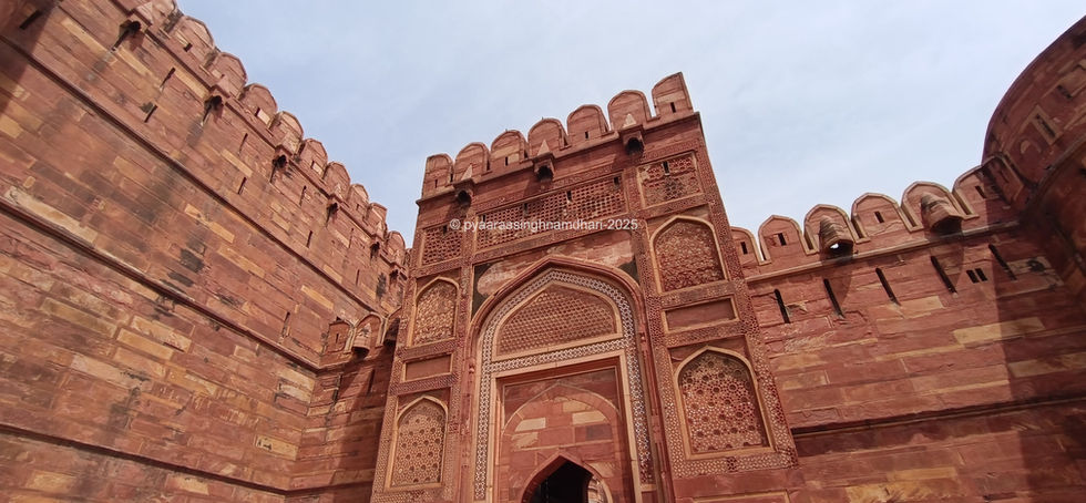 The main entrance of the fort, captured from below to show the scale and the artistry of its Mughal design.