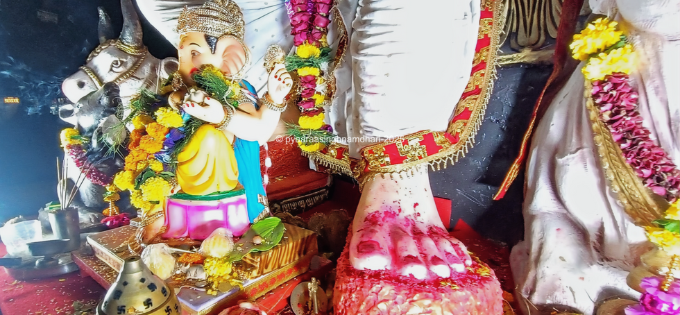 At the base of a towering deity’s idol, a beautifully adorned Ganesh murti sits bathed in warm light and garlands of fresh marigolds and roses. Incense smoke curls in the air, mingling with the scent of flowers and camphor, while offerings of sweets and betel leaves rest at its feet. The massive foot of the larger deity, smeared in crimson kumkum, anchors the scene, symbolizing divine blessings and the humble devotion of the worshippers gathered around.