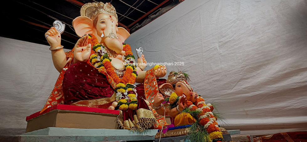 Bathed in warm light, the towering Ganesha sits in silent majesty while the smaller idol at his side mirrors the same grace. Draped in marigolds and crimson, they look like watchful guardians of devotion — a still frame from a mythic saga.