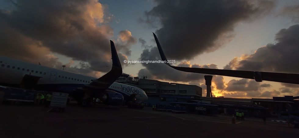 On the runway, one plane readies in silence while another carves into the evening sky — a reminder that every journey begins from stillness.
