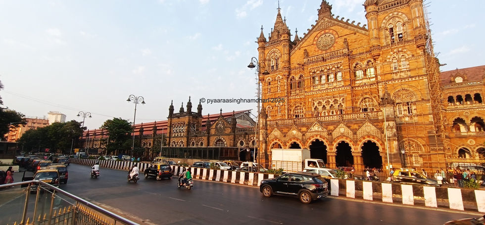 A close-up view of the Chhatrapati Shivaji Maharaj Terminus, showcasing its detailed Gothic architecture under the warm glow of the evening light, with the daily city traffic passing in front.